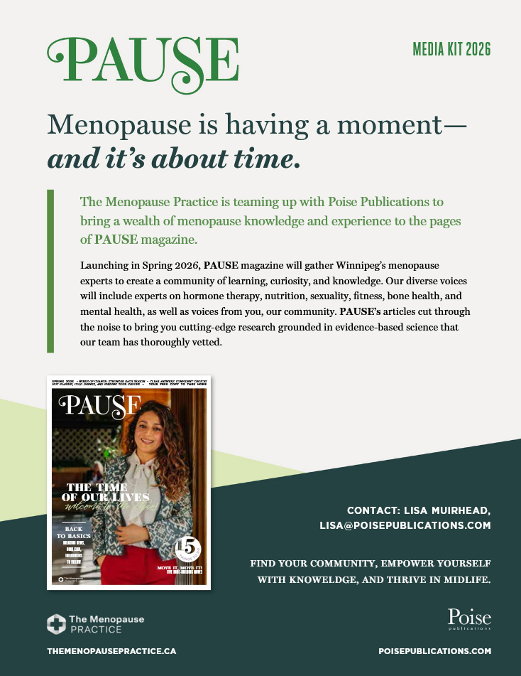 PAUSE magazine is produced in partnership with The Menopause Practice. PAUSE magazine will gather Winnipeg’s menopause experts to create a community of learning, curiosity, and knowledge. Our diverse voices will include experts on hormone therapy, nutrition, sexuality, fitness, bone health, and mental health, as well as voices from you, our community.